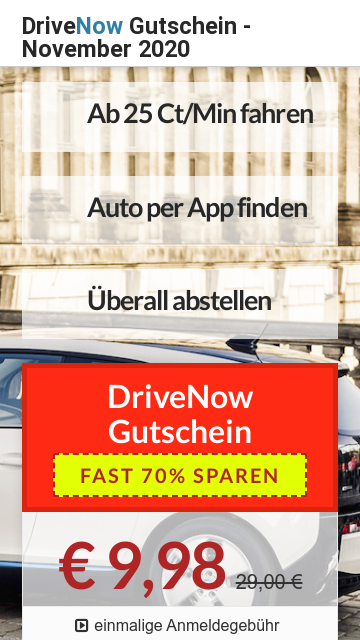 Bei uns erhalten Sie im Rahmen einer exklusiven Pro-Aktion einen 81% Gutschein für den Carsharing-Dienst Drive Now