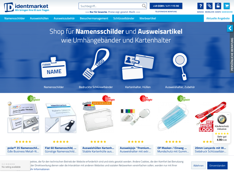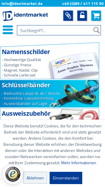 identmarket ist ein Onlineshop für Werbeartikel: Namensschilder, Schlüsselbänder und Ausweishüllen und -zubehör. Spezielle Artikel auf Fragen zum. . .