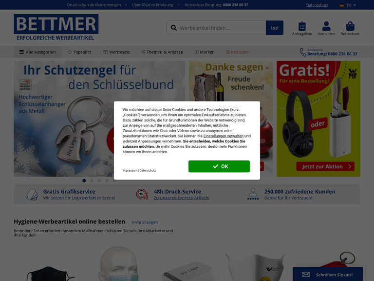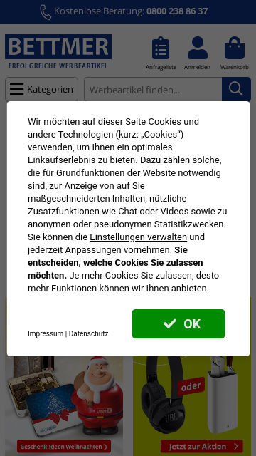 Das Sortiment von Bettmer umfasst Werbemittel, Werbegeschenke und Streuartikel, wahlweise mit oder ohne Werbeanbringung.
