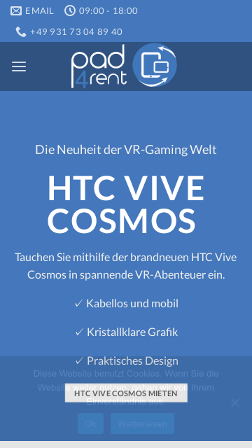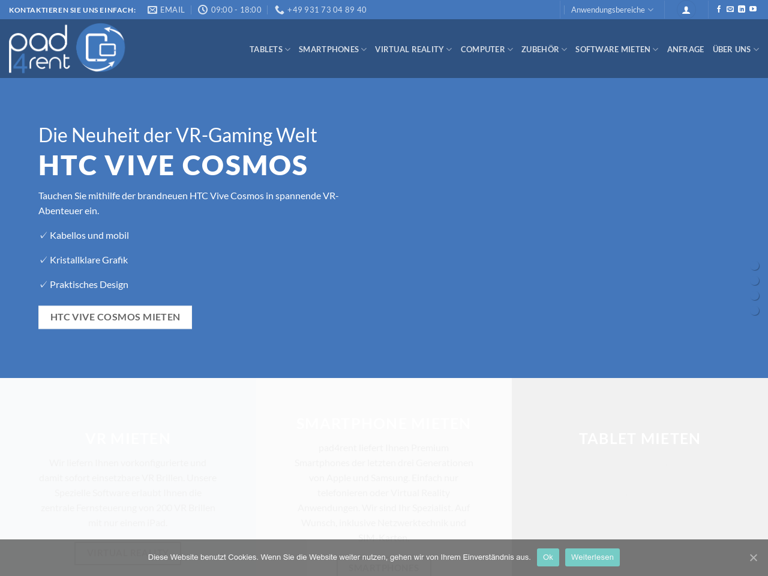 Pad4Rent® ist Ihr professioneller und zuverlässiger B2B Partner für die kurzzeitige Miete von Hardware. Zu unseren Produkten zählen Tablets, Smartphones, Virtual Reality, Notebooks und andere Computer. Kurzum alles was Sie für ein erfolgreiches Event benötigen Auf Wunsch liefern wir Ihnen alle Geräte direkt einsatzbereit nach Ihren Wünschen konfiguriert. Sollten Sie Interesse an einem Leasing bzw. Langzeitmiete haben